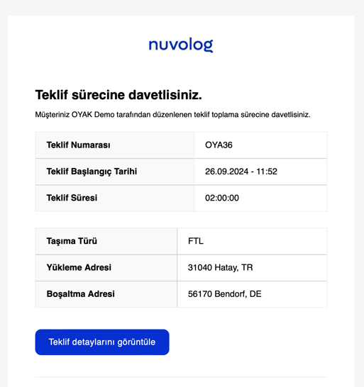 Gönderici tarafından bir teklif toplama sürecine davet edilirseniz sistem tarafından sizlere otomatik bir e-posta gönderilir.