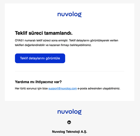 Nuvolog sistemi üzerinde tamamlanan bir teklif talebi süreci sonunda aşağıdaki gibi otomatik bir e-posta alırsınız. Böylelikle teklif verme süresinin tamamlandığından haberdar olursunuz.
