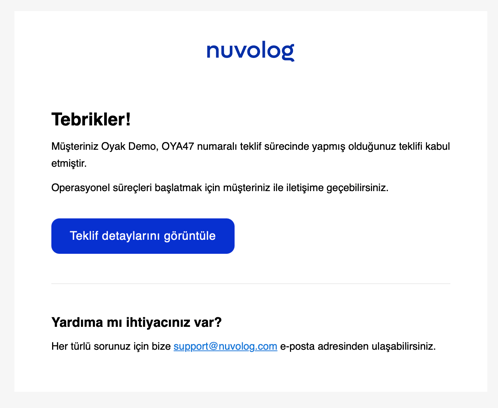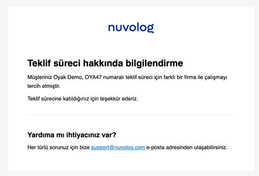 Nuvolog sistemi üzerinde bir teklif talebi süreci tamamlandığında eğer talep sahibi firma sürecin kazananını seçerse iki aksiyon gerçekleşir. Böylelikle gönderici firmaya tekrardan sürecin sonucunu sormaya gerek duymazsınız.