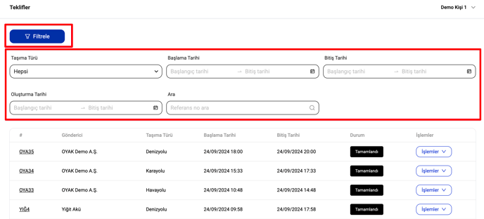 Açılan filtre bölümünde aşağıdaki bilgilere göre teklif taleplerini filtreleyebilirsiniz.