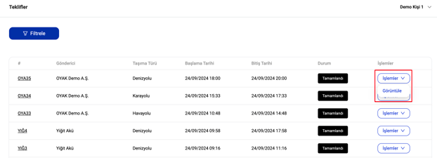 Herhangi bir teklif sürecinin detaylarına erişmek için, ilgili satırda işlemler butonuna gelip "Görüntüle" diyebilirsiniz.