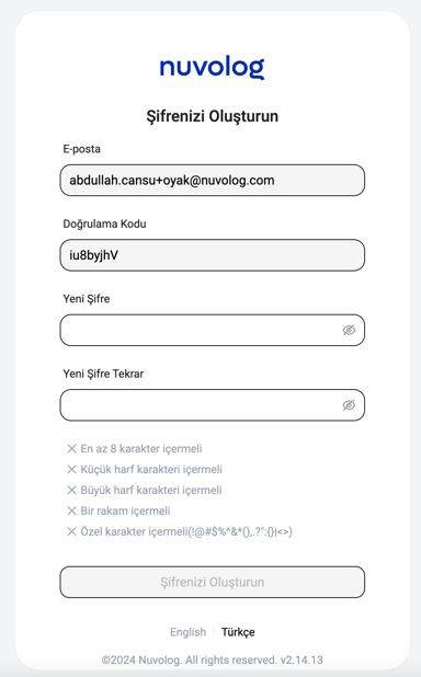 İlgili alanları doldurduktan sonra "Şifrenizi Oluşturun" butonuna tıklayarak şifre güncelleme işleminizi gerçekleştirebilirsiniz.